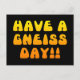 Have A Gneiss Day!! - yellow-orange lettering on a black postcard.