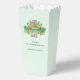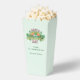 Popcorn favour boxes with a St. Patrick's Day themed image. A retro grunge style design which says: Have a lucky day. With a colourful rainbow behind. Words written in a fat rounded retro style vibe. Pink and green colours.