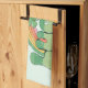 A kitchen towel with a St. Patrick's Day themed image. A retro grunge style design which says: Have a lucky day. With a colourful rainbow behind. Words written in a fat rounded retro style vibe. Pink and green colours.