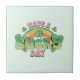 Ceramic tile with a St. Patrick's Day themed image. A retro grunge style design which says: Have a lucky day. With a colourful rainbow behind. Words written in a fat rounded retro style vibe. Pink and green colours.