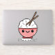 Cute cut sticker featuring an adorable pink bowl of white rice. The bowl has a happy kawaii face and the rice has two chopsticks stocking out the rive. Below is a play on words saying Have rice Day! in black text.