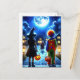 Scary Halloween postcard with ai art depicting a little boy and girl in a clown and witch costume walking out the house to encountered a scary monster at the end of their sidewalk.
