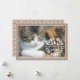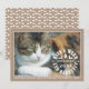 Have a warm and purrfect holiday pet Christmas photo card. It features the text "Have a warm and purrfect holiday" forming a circle accented with a dividers, deer and tree and a photo of your beloved cat. Around it there is a border of kraft paper. The back includes a cat pattern in white on kraft paper.