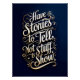 Inspire yourself and others with this stunning motivational wall art poster featuring an elegant typographic design. Showcasing the empowering message "Have stories to tell, not stuff to show" this piece combines a rich navy blue background with warm, golden-hued lettering and decorative flourishes.