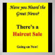 Something for everyone offers customised personalised haircut sale poster especially designed to promote and market your business. This uniquely designed haircut sale poster will not only bring a smile to your clients but they will also enjoy telling their friends about it. As a licensed cosmetologist I know firsthand the importance of promoting a salon, therefore it is wise to continuously change and market your shop as your clients’ needs increase. Happy promoting everyone…Good luck!
