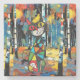 A whimsical cat with a geometric, stained-glass appearance stands in a vibrant forest of birch trees. The background features a colourful blend of autumn leaves and hues of blue and yellow. Digital Art Photoshop