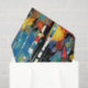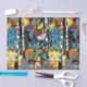 A whimsical cat with a geometric, stained-glass appearance stands in a vibrant forest of birch trees. The background features a colourful blend of autumn leaves and hues of blue and yellow. Digital Art Photoshop