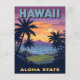 Bring the magic of the Aloha State to life with this stunning, vintage travel poster postcard! The design captures a breathtaking Hawaiian sunset (or sunrise) over the ocean, complete with dramatic palm tree silhouettes and distant mountains. The vibrant palette of orange, yellow, purple, and blue evokes a true tropical paradise. Featuring the bold text "HAWAII ALOHA STATE," this retro-style art is perfect for sending greetings, collecting as a souvenir, or framing as a piece of unique tropical wall art. A must-have for Hawaii lovers, beach enthusiasts, and anyone who dreams of island getaways.