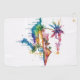 Scenic Hawaii design with colourful splatters in rainbow colours with mountains, palm trees and waves decoration