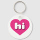 This key chain features a vibrant hot pink heart containing the bold, white, rounded lower case letters hi, a playful abbreviation for Hawaii, the aloha state.