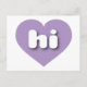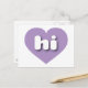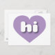This postcard features a shapely and cool lavender heart containing the bold, white, rounded lower case letters hi, a playful abbreviation for Hawaii, the aloha state. The reverse side of the postcard is blank, awaiting your customised text or handwritten sentiments.