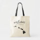 Welcome guests to your Hawaii wedding with these chic and modern personalised tote bags. Design features "welcome" in modern handwritten calligraphy script, with your initials joined by a heart, along with your wedding date, inside a black silhouette map of the state of Hawaii. Personalise with a specific Hawaii city or location name if desired.