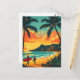 A festive postcard featuring a tropical Hawaii Christmas with surfers in Santa hats, palm trees, and a golden sunset beach scene. A fun and unique holiday greeting card.