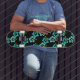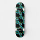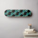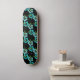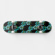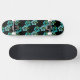 This skateboard is shown with a black background colour with a teal blue Hawaiian tropical flowers print.