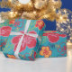 Colourful floral hibiscus flowers in pinks and orange with green leaves, Hawaiian inspired pattern on a blue background.