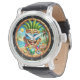 This vibrant round timepiece offers a cheerful tropical welcome. It features a smiling figure wearing cool blue sunglasses and a pineapple leafy hat, surrounded by elements of a sunny beach scene. Palm trees, a calm blue ocean, a bright sun, a refreshing green cocktail, and colourful leis fill the background. A "WELCOME" sign stands on the sandy beach. The timepiece has a black frame, emphasising the colourful and festive island vibe.