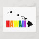 The name of the state of Hawaii in colours of the rainbow, along with the shape of the islands.