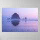 The image shows Haystack Rock and other rock formations at Cannon Beach, Oregon, during a serene sunset. The sky is a gradient of soft purples and blues, creating a tranquil atmosphere. The wet sand reflects the sky and the rocks, enhancing the sense of calm. The water is still, mirroring the shapes of the rocks above.