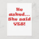 He Asked She Said Yes Announcement Postcard
