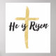 Celebrate the resurrection of Jesus with this elegant brush script typography design with words in black, which declare, "He is Risen." Background is hand-drawn cross in gold foil (digitally rendered) style. Biblical reference is from Matthew 28:6.