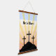 The vivid colours and crisp lines of the design are printed on soft, lightweight polyester, ensuring a visually impactful display on any wall. The poignant silhouette of the crosses serves as a powerful reminder of the sacrifice, while the bold text, "He is Risen!", proclaims the triumphant victory over death.