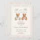 This He or She gender reveal teddy bear baby shower invitation features two classic storybook teddy bears—one dressed in soft blue and the other in blush pink—set against a neutral striped frame for a timeless and elegant look. Designed to keep the surprise alive, this invitation is perfect for parents planning a gender reveal baby shower with a soft, traditional, and charming aesthetic.