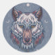 Multicolored heads of wolves with boho decoration and sacred symbols on a grey background. Seamless pattern with contour tribal drawing of predators. Vector texture with animals. Native wallpaper
