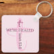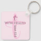 This keychain features a light pink cross with a healing Bible verse. Text is customisable.