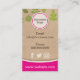 A natural organic business card design for the health business or businesses geared towards nature or natural skin care, food or healthy eating. It has a brown kraft paper background, with a green leaves pattern and accents of hot pink for a bit of fun. Also great for health stores, holistic therapists, natural spa clinics, people geared towards vegetarian and vegan and similar all-natural, organic industries.