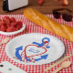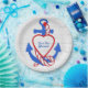 Red and blue heart nautical anchor with rope graphic on rustic whitewashed wood background.