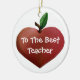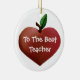 Sweet round ceramic ornament with graphic artwork of a heart shaped apple, on both sides. White whimsical text reads, To the Best Teacher, on the front, and personalised, with teachers name and additional text, on the back. Personalise the text to read anything you want. Great Christmas tree ornament any teacher will enjoy.