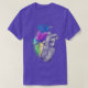 I give wanted to give this a 4 instead of a 5 because these Basic DARK T0shirts run unexpectedly SLIM or Narrow. Which is great if you do not have a potbelly, but I have a paunch. It isn't the shirt's fault that I've got a beer belly. The design and shirt itself is a quality cotton shirt. The color is more of a deep purple, but still a very pretty color. The Basic DARK T-shirts run a bit SLIMMER than the Basic Ts. The neck is a fraction narrower (or seems to be narrower) also. I'm a paunchy middle-aged woman and my neck is 12 inches (31cm) thick and the neckline fell about the same as in the photo of the man, and I had the desire to tug it a bit. So if you're a thick necked man or like loose shirts, be aware these are slimmer shirts. Once I get rid of my lockdown paunch it'll look great. The shirt washed well in cold water with no apparent bleeding. We don't have a dryer, so it hung dry. Did not shrink. Love the colors and the design. The design looks smaller on my shirt than it does on the model on-line. But still, it looks good on the shirt. The printing looks as it does on the model, just the size seems fractionally smaller. Washed garment in cold water, hung dry and design appeared unaffected.