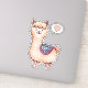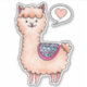 Cute watercolor painting of a whimsical tan llama with a multi coloured patterned cloth on its back. To the right is a speech bubble with a cute pink heart inside.