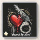 This vintage black-and-white illustration showcases a handcuff and handgun alongside a bleeding red heart, set against a dark background with soft light accents. The gold touches add elegance, capturing the intense themes of love and conflict.