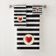 Elegant towel set with beautiful heart with black and white stripes on the background. Chic modern towel set.