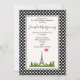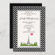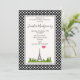 A birthday party invitation with a french theme. The background is composed of a cute black and white polka dot pattern. A white frame with a black border layered over top. A whimsical drawing with the Eiffel Tower in the background surrounded by green trees.