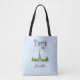 A tote bag with a whimsical drawing of the Eiffel Tower in the background surrounded by green trees. A pink heart and Paris typography add a girlish flair. The background is a light blue watercolor texture. Personalise with a name in a fancy hand written font.