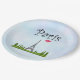 Paper plates with a whimsical drawing of the Eiffel Tower in the background surrounded by green trees. A pink heart and Paris typography add a girlish flair.