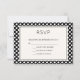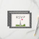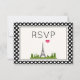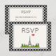 A RSVP card with a whimsical drawing of the Eiffel Tower in the background surrounded by green trees. The background has a nice black and white polka dot pattern.