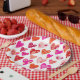Scandinavian style modern contemporary heart pattern in red, pink and orange. Bright and happy design, perfect for Valentine's Day, or everyday. Original art by Nic Squirrell.