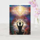 Silhouette of meditator saluting heart of light above with colourful abstract background. By Daniel B. Holeman.