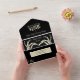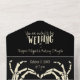 Create a creepy cool wedding invitation. This all-in-one style invitation has an invite and removable RSVP card. It features a black and cream or ivory colour scheme with an illustration of skeleton hands in a heart shape that's perfect for Halloween or goth themed weddings.