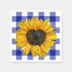 Yellow sunflower with heart-shaped centre and ladybug on blue and white buffalo plaid.