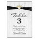 Black satin ribbon in heart with baby's breath bouquet on rustic whitewashed wood for table number tent.