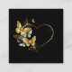 Gold heart shaped frame, decorated with gold, jewellery and white butterflies on black background.