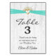 Aqua ribbon in heart with baby's breath bouquet on rustic whitewashed wood for table number tent.
