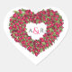 Heart shaped wreath of spring red tulips flowers inked art wedding or anniversary favour stickers. Add your own couples monogram initials. Inked in black with flat red and green background colour on a white background. Other colours and matching wedding items available. © Original ink drawing and design by Sarah Trett for www.mylittleedenweddings.com on Zazzle.