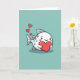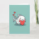 This card shows a sweet, human-like fish with a rounded white body dotted with soft gray spots, centered on a wide teal background. It holds a large red heart close to its chest as if hugging it tight, giving the scene a gentle, affectionate feel ❤️. The fish’s simple eyes and wide smile, along with rosy cheeks, make it look like it’s beaming at someone just out of view 🥰. Three smaller red hearts drift above its tail, like little kisses rising into the air. There’s no greeting text on the front, leaving the teal space open and calm while the reds stand out. Crisp outlines keep the shapes clear and graphic, and the teal backdrop stays smooth and uncluttered. A small, flat shadow sits beneath the fish, grounding it against the teal field.