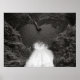 A black and white photograph of a heart shaped pool, that is seen overlooking a waterfall.
