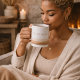 Hearthtrace serif text anchors a white surface wrapped in horizontal brown dash lines resembling stitched detailing. The restrained contrast pairs easily with wood tables and soft kitchen tones, suited for morning routines, desk sipping, or open-shelf styling with warm-toned drinkware.